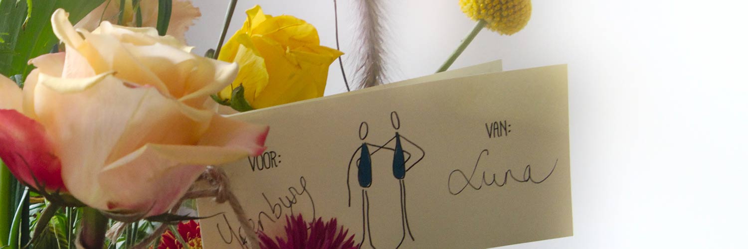 Een jong meisje deed wat schuchter open, maar begon te stralen toen ze hoorde dat de bloem van een vriendin kwam, een dame moest huilen van ontroering en een oma glom vol trots omdat haar kleinkind een hele boerderij op het kaartje had getekend. Ook belde ik aan bij ‘De Oever’, het huis voor verstandelijk beperkten bij ons in de straat. Een buurman had de bloem aan hen gestuurd. Ook deze ontvanger was, na een korte verbazing over dit gebaar, zichtbaar ontroerd en dankbaar. Het lijkt een klein gebaar, een bloem geven aan iemand om te vertellen dat je elkaar waardeert. Maar het is niet klein. Je zet een schijnwerper op iets bijzonders, IETS wat er is tussen jullie.